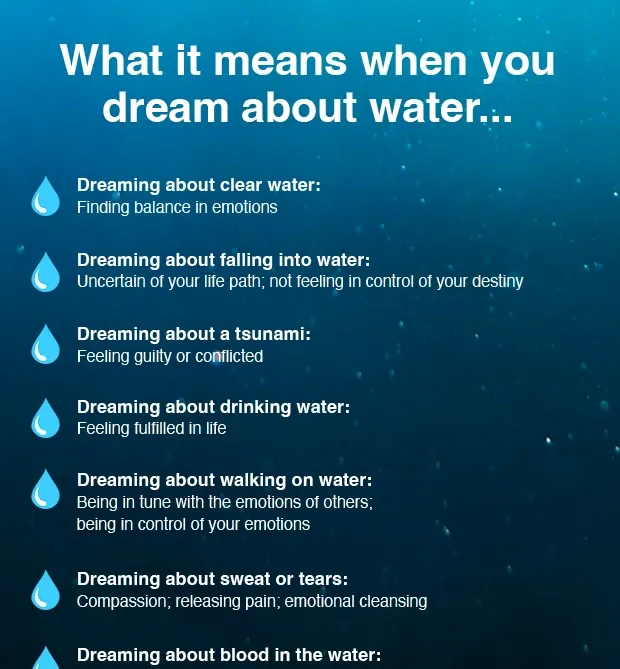 Voda kot simbol je pogosto predstavitev nezavednega. Tekoče vode, kot so reke, lahko predstavlja nezavedni tok življenja. Bazeni so bolj osebni vidiki nezavednega. Velika vodna telesa, kot so oceani, so globlje ravni nezavednega. Voda čisti kopeli in krsti pravi Greg Mahr Md Psihiatrist avtor ' Modrost sanj „In direktor za posvetovanje Psihiatrija v bolnišnici Henry Ford v Detroitu.